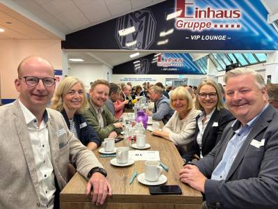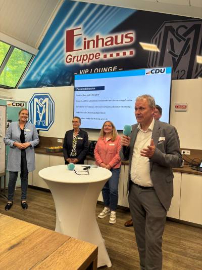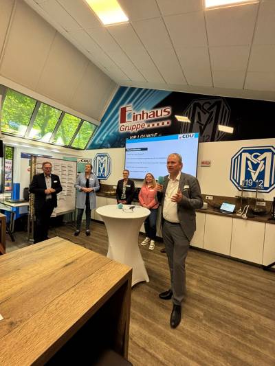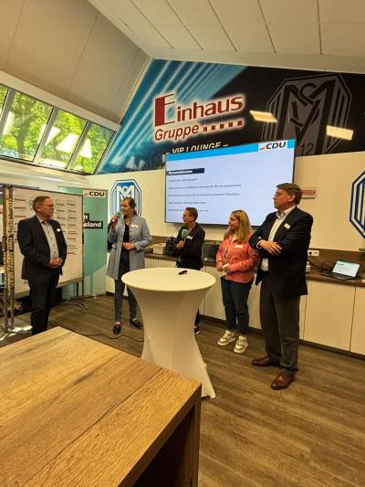 Das Bild zeigt unter anderem die Verteter der CDU Papenburg, sowie die Kreisverbandsvorsitzenden Aschendorf/Hümmling und Meppen Jens Willerding und Holger Cosse Am 10. Mai 2025 fand in der Hänsch-Arena des SV Meppen ein außergewöhnliches Format der CDU Emsland statt, an dem auch Vertreter der CDU Papenburg teilnahmen.